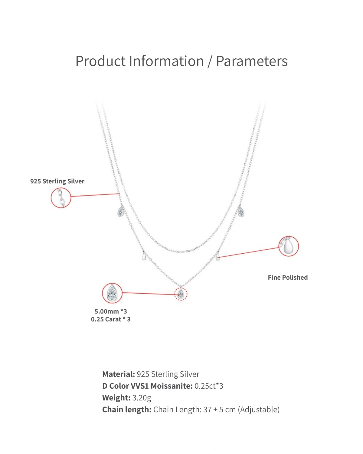 This double-layer teardrop necklace features three D Color VVS1 moissanites, each cut with 3EX precision for exceptional brilliance and fire. Designed in 925 sterling silver with a fine-polished finish, it adds just the right amount of shine to any outfit — from casual days to special occasions.