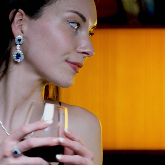 Surrounding these exquisite drop earrings is a halo of sparkling cubic zirconia, creating a breathtaking display of luxury. Perfect for elevating any outfit, they are sure to command attention at any occasion. Add a touch of sophistication to your jewelry collection with these captivating gems.